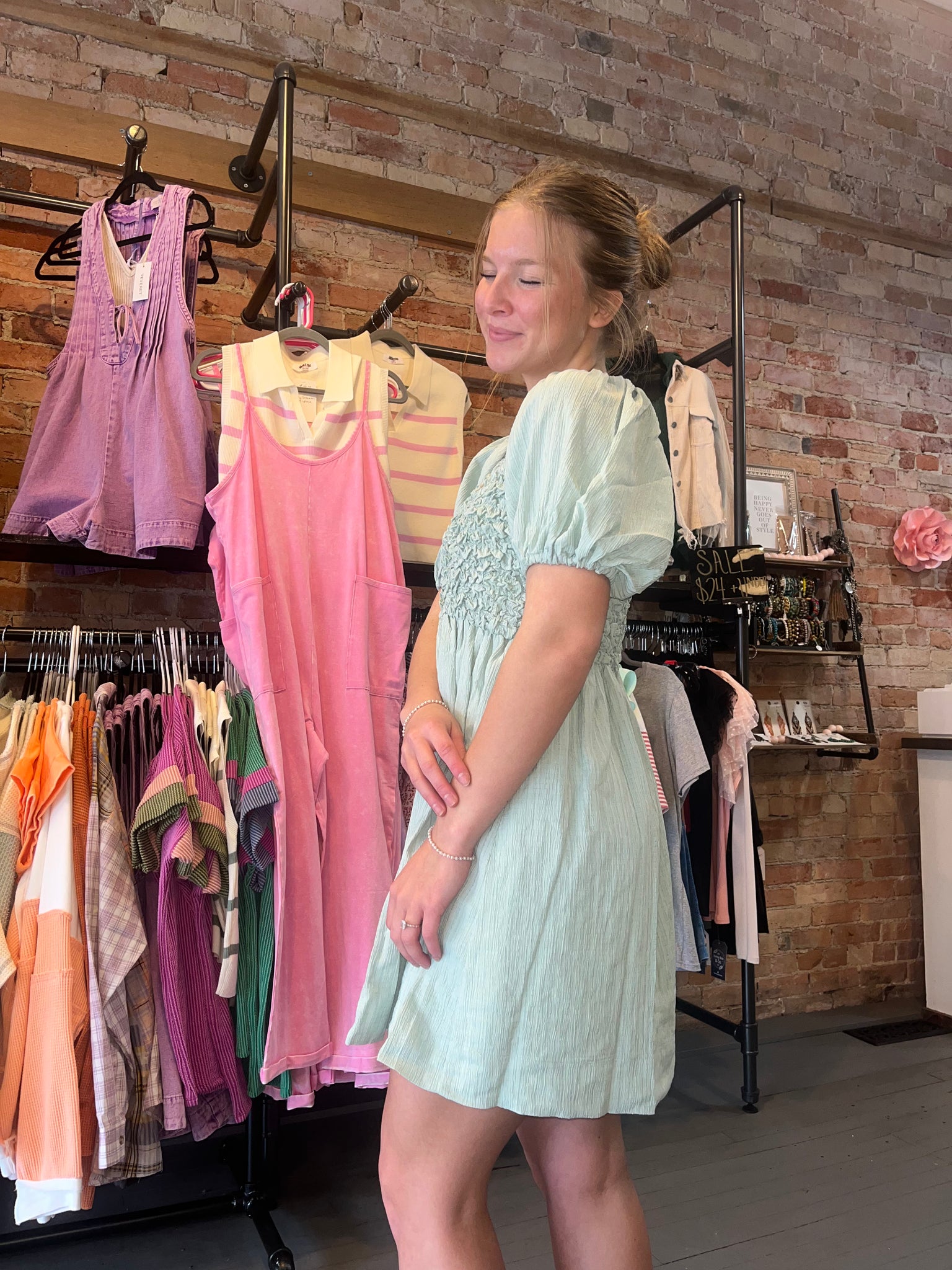 TEXTURED WOVEN DAILY DRESS WITH PUFF SLEEVES