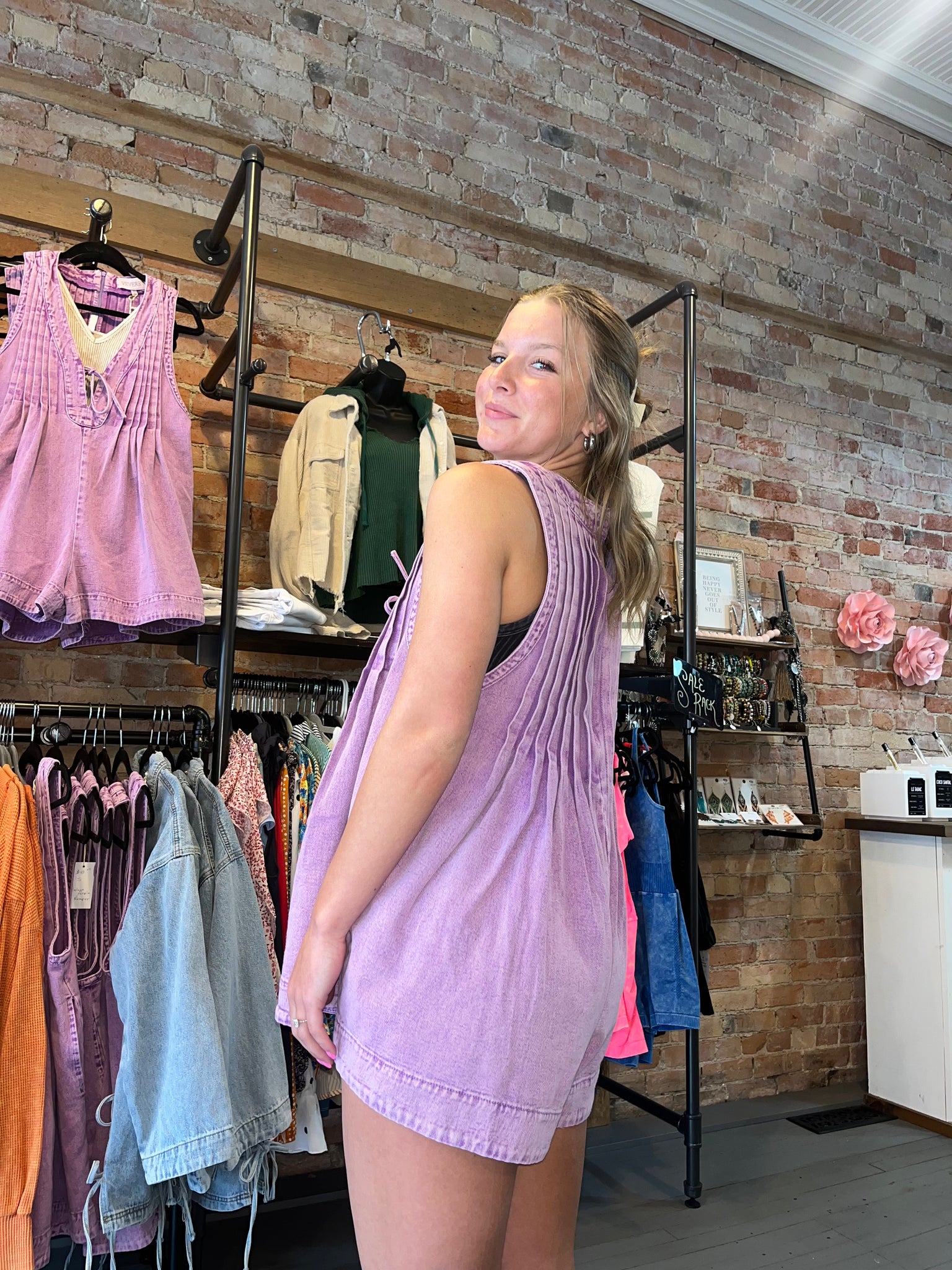 -Washed denim -Deep v-neck with string tie -Pleated detail back -Sleeveless -Side pocket