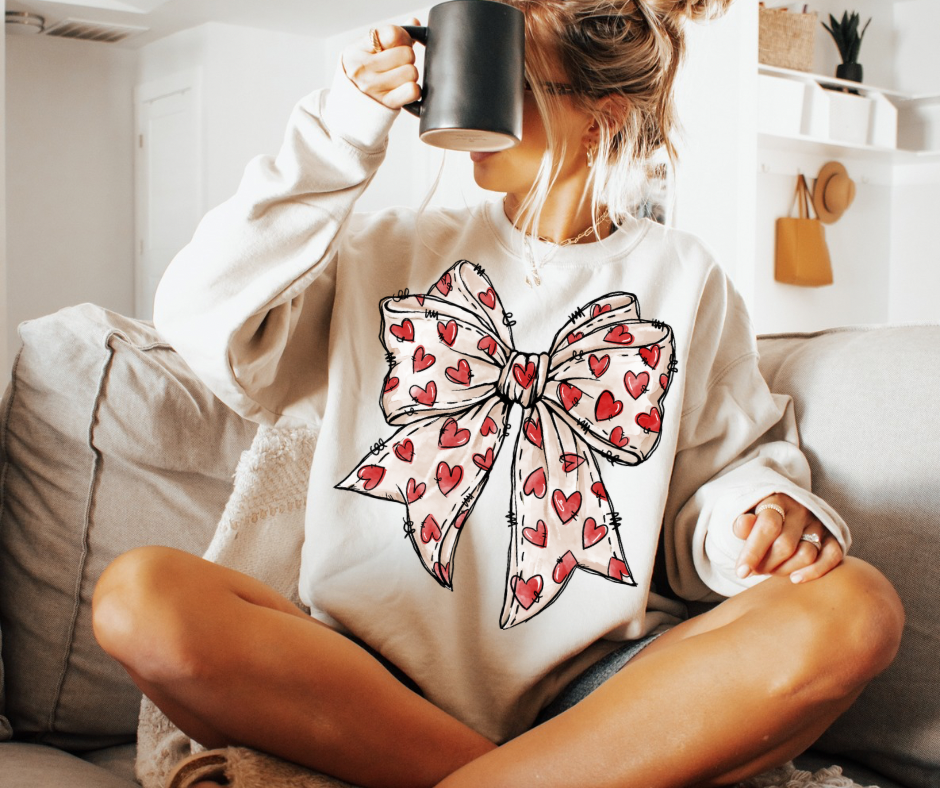 -Gildan 50/50 Sweatshirt- Valentines Bow -Wash shirt inside out, no fabric softener and tumbler dry low.