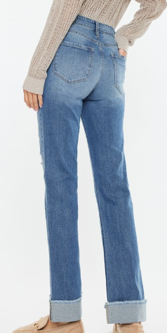 HIGH RISE STRAIGHT JEANS ZIPPER FLY MEDIUM WASH COMFORT STRETCH STRAIGHT LEG 2 1/2" SINGLE CUFF
