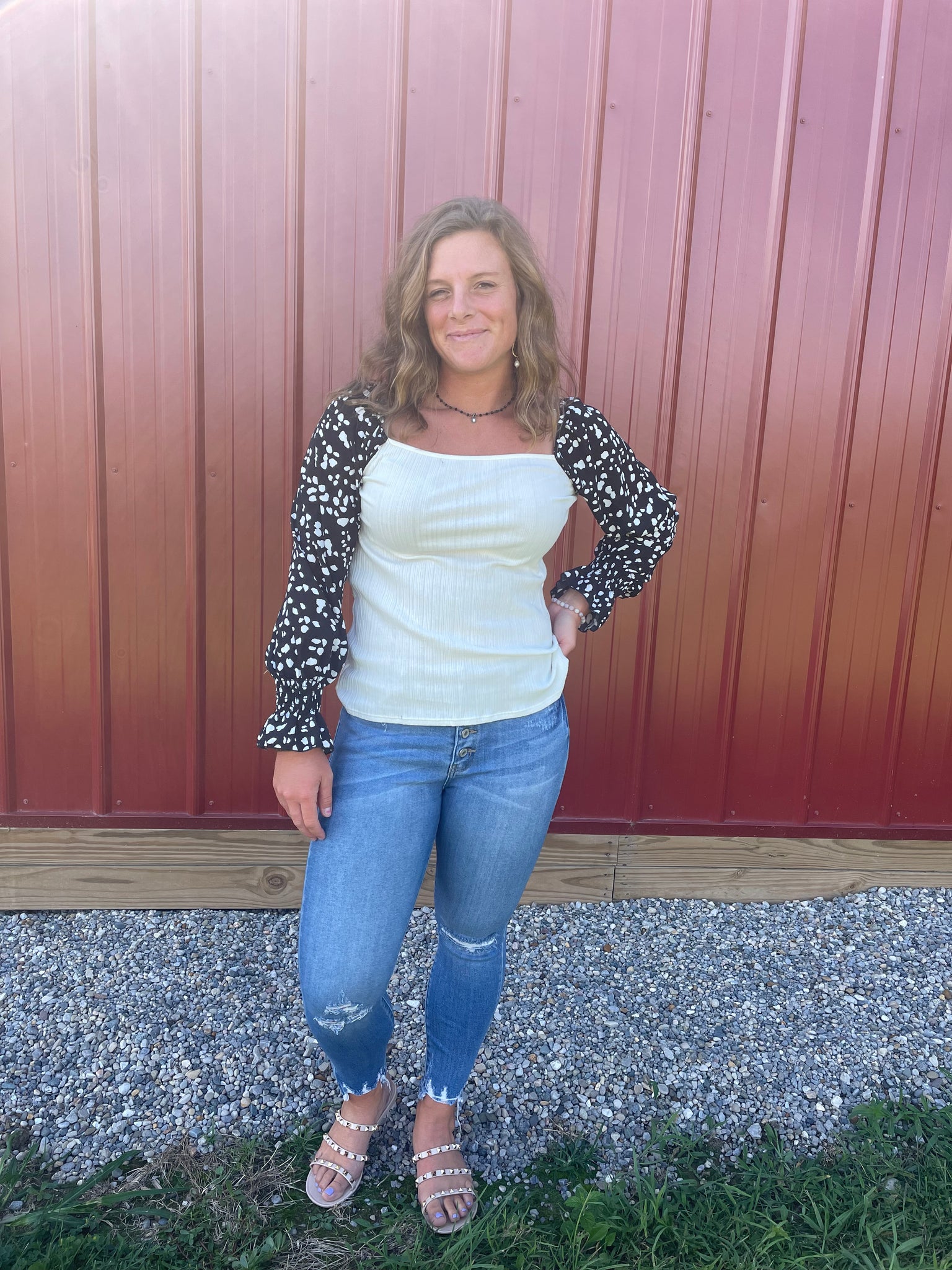 COTTON SPAN VARIEGATED RIB KNIT WITH LEOPARD SHRRING SLEEVE AND SQUARE NECK TOP