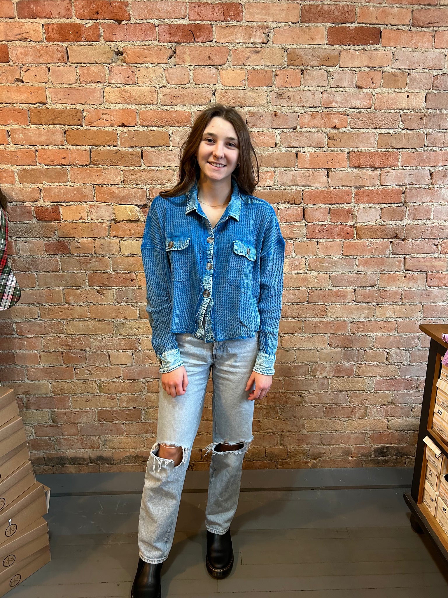 ACID WASH OVERSIZED COTTON WAFFLE CROPPED SHACKET - CROPPED LENGTH - FRONT BUTTON CLOSURE -